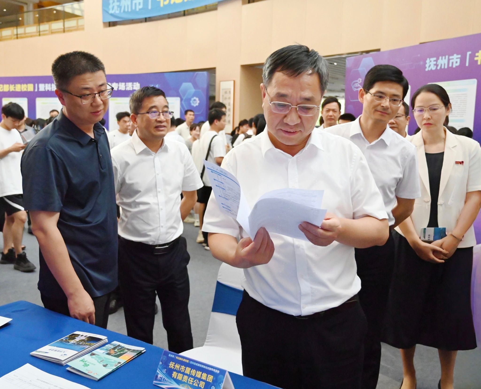 现场还举行了高校毕业生现场招聘和“百博进百企”暨产才融合对接活动。在图书馆一楼,来自抚州的39家企事业单位带来500余个优质岗位,涵盖教育、医疗、智能制造、现代农业、绿色环保等领域。我校毕业生踊跃投递简历,与用人单位面对面交流,招聘会现场气氛热烈。22家抚州企业与在赣高校、科研院所及抚籍在赣博士人才进行深入对接,推动高层次人才团队与产业需求有效匹配、有效落地。